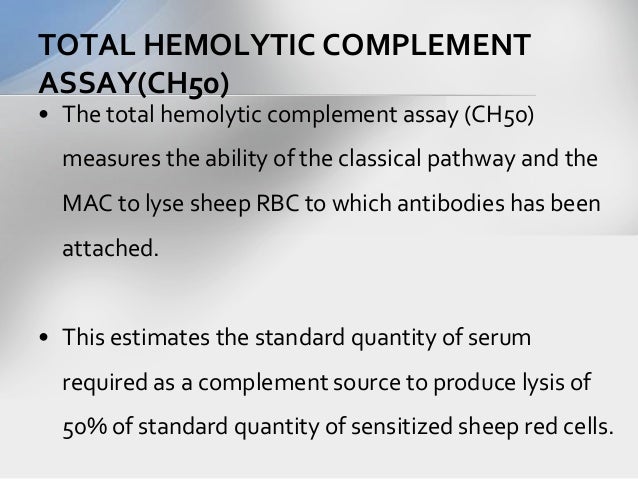 Laboratory diagnosis of complement deficiency. The CH 50 , AH 50 , and... |  Download Scientific DiagramWe speak English Spanish speaking representatives Available M-F 11am-8pm CDT You will automatically register in seconds. Total blood tests (CH50) A CH50 test is used to help determine any protein abnormalities and deficiencies in the supplement system. Code of Test: 001941 Also known as: Complete test of hemolytic supplement, CH50 Methodology: Quantitative lipose lypose by spectrophometry Preparation: No special preparation required. Test results: 2-3 days. It can take more time based on delays in time, vacation or lab. Test Code: 618Also known as: Complete Hemolitic Complement Test, CH50 Methodology: LiposomePreparation: No special preparation required. Test results: 5-7 days. It can take more time based on delays in time, vacation or lab. Description The Total Complement or Blood CH50 Test, evaluates the overall activity of the plug-in system, and mainly evaluates the classic plug-in activation route. A CH50 blood test is often ordered to evaluate the non-component deficiency and to evaluate the complementary activity in cases of complex immune disease, glomerulonephritis (inflammation of the kidney filters), rheumatoid arthritis and cryoglobulinemia (abnormal proteins in the blood that thickens in cold temperatures). It can also be used to evaluate a patient's response to systemic erythematous lupus therapy (SLE) and predict disease bengales. A total measurement of complements, also known as a total hemolytic complement or a CH50 measurement, checks how well the complement system works. This test is usually ordered for people with a family history of supplemental deficiency and those who have symptoms of:The meaning of the supplemental blood test is explained: See also Related Tests (6)Confidenced, safe, " confidential © 2021, Walk-In Lab, LLC. All rights reserved. Information subject to change without notice. By signing in, you agree to our offers and today