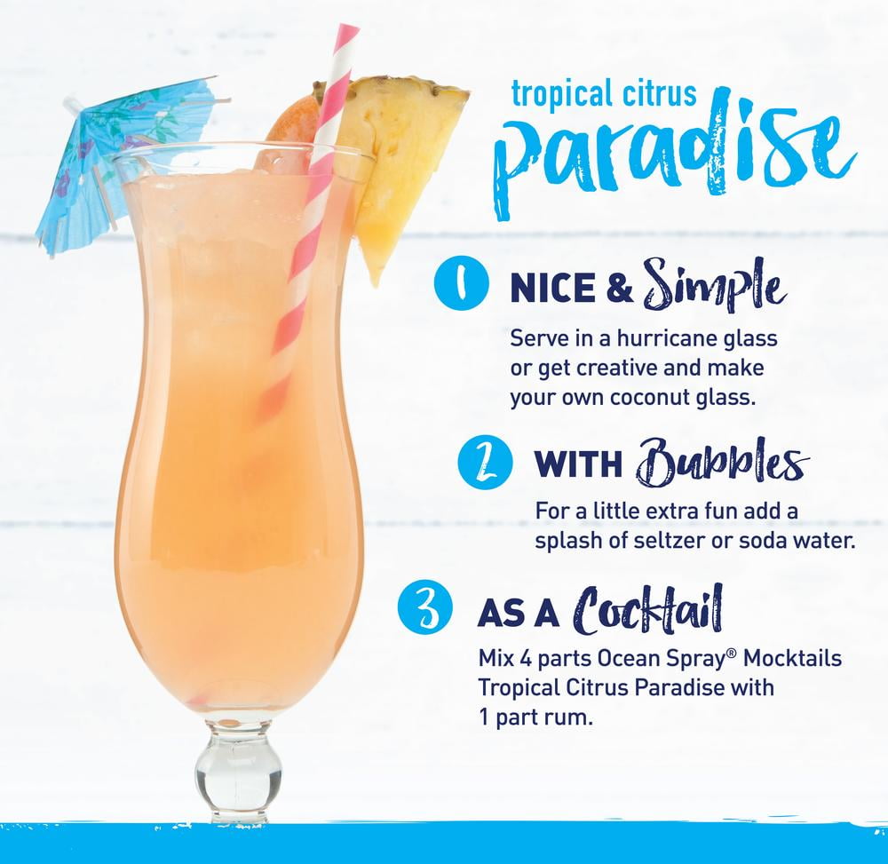 Buy 2 Ocean Spray Tropical Paradise Mocktails 338 oz 149 each wyb 4 participating beverage items thru 19 Use 2 2002 Ocean Spray Cranberry Juice Cocktail AND Ocean Spray Tropical Paradise Mocktail printable. Up to 7 cash back Ocean Spray Mocktails are delicious premium non-alcoholic juice drinks inspired by your favorite cocktails. Head over to Kroger and buy two Ocean Spray Tropical Paradise Mocktails 338-64 oz 199 sale price through 12 and buy two Ocean Spray Cranberry Juice Cocktail 64 oz 199 sale price through 12.