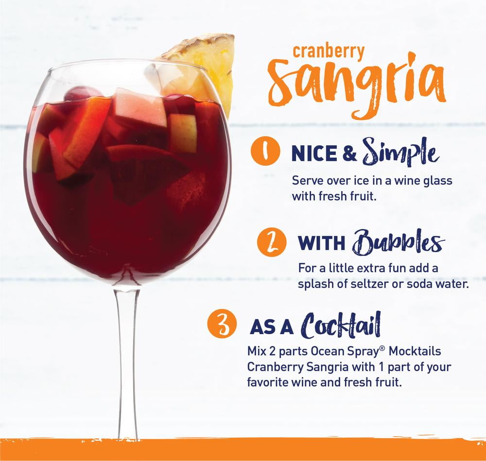Weve paired the taste of crisp cranberry and sweet peach to create a sophisticated bellini blend thats perfect to enjoy straight from the bottle or mixed with sparkling water wine or liquor. Up to 7 cash back Free 2-day shipping. Weve paired crisp taste of cranberry with pineapple citrus and apple to create a sophisticated sangria blend thats perfect to enjoy straight from the bottle or mixed with sparkling water wine or liquor. Find cranberry juices recipes and more information about cranberry health and our farmers. Enjoy the crisp clean taste of cranberries from Ocean Spray. Buy 2 Ocean Spray Tropical Paradise Mocktails 338 oz 149 each wyb 4 participating beverage items thru 19 Use 2 2002 Ocean Spray Cranberry Juice Cocktail AND Ocean Spray Tropical Paradise Mocktail printable. Ring in the New Year with Ocean Spray.