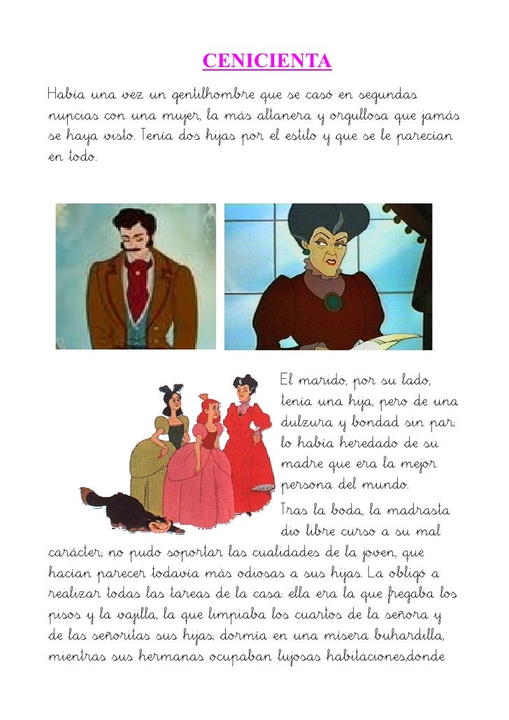 Resumen de la cenicienta. Todos los animalitos la querían mucho - especialmente dos ratoncitos llamados Gus y Jaq. Si la ven me cuentan que les pareció a ustedes. En esta no hay hada madrina sino un amo bondadoso que.
